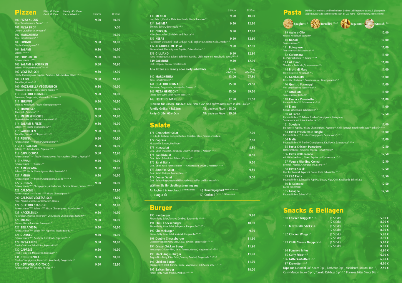 Genieße unsere frisch gebackenen Pizzen, die mit Liebe und besten Zutaten zubereitet werden. Ob klassisch Margherita, würzige Salami oder kreative Spezialitäten – bei uns findest du garantiert deine Lieblingspizza. Knuspriger Teig, aromatische Saucen und frisch belegte Toppings machen jeden Bissen zu einem Genuss.