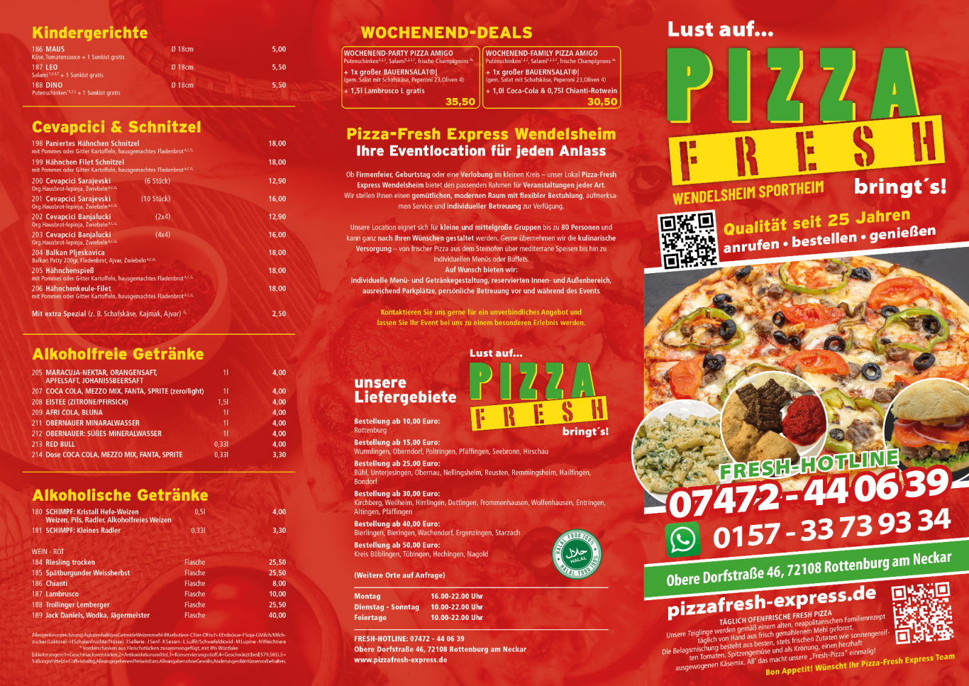 Bei Pizza Fresh bringen wir den authentischen Geschmack Italiens direkt zu dir nach Hause oder ins Büro. Frisch zubereitete Pizzas, die mit hochwertigen Zutaten und viel Liebe gemacht werden – das ist unser Versprechen an dich!